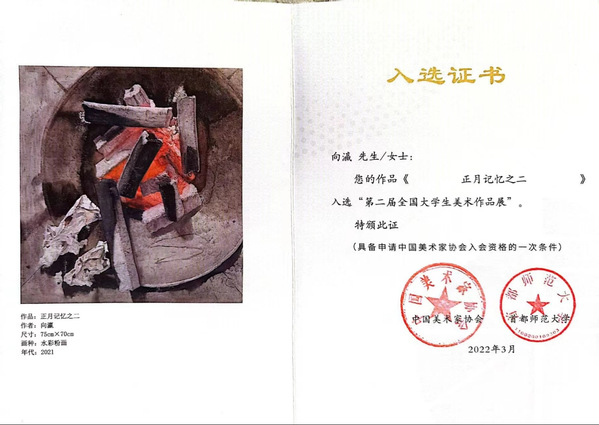 本网讯 日前,由中国美术家协会主办的“第二届全国大学生美术作品展”评选结果揭晓,我校美术学院涂远芳教师指导的由向瀛同学创作的《正月的记忆之二》获最高奖(具备申请中国美术家协会入会资格),并在中国美术馆展出。