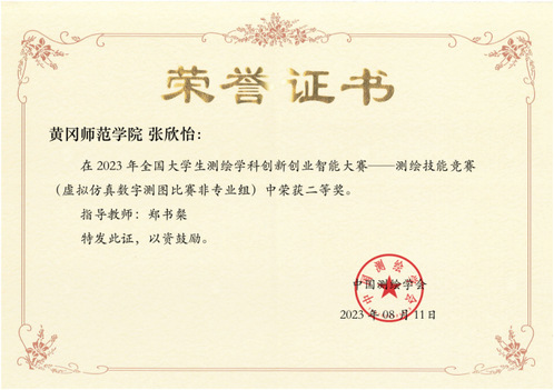 本网讯 近日,2023年全国大学生测绘学科创新创业智能大赛落下帷幕。我校建筑工程学院郑书粲老师指导的4名参赛选手经过努力拼搏,取得喜人成绩,其中李铜获得一等奖,张欣怡和庞振帅均获二等奖。