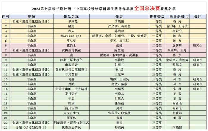 本网讯 2023第七届米兰设计周中国高校设计学科师生优秀作品展省赛、国赛、优秀作品展等系列活动落下帷幕,我校参赛作品获得全国总决赛国家级奖项23项(其中一等奖5项、二等奖3项、三等奖15项),湖北省赛区省级奖项82项(其中一等奖12项、二等奖22项、三等奖48项),实现了该项赛事上获奖数量和获奖质量双突破。因赛事组织工作表现突出,学校荣获优秀组织单位奖。