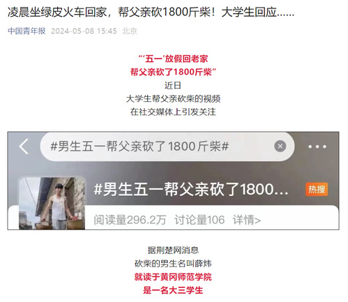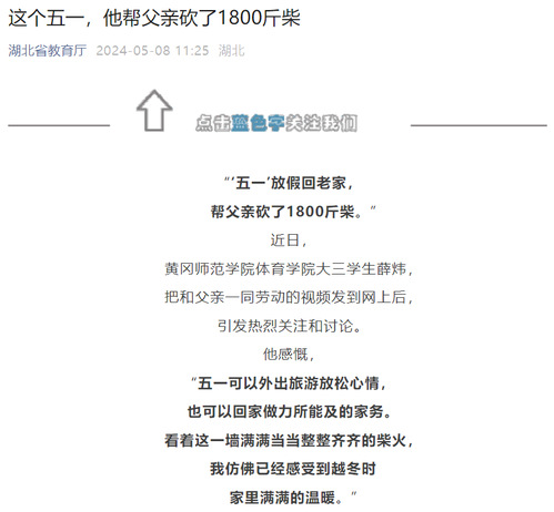 近日,我校体育学院大三学生薛炜五一回老家帮父亲砍了1800斤柴的故事在社交媒体上受到热烈关注和讨论,人民日报、半月谈、中国青年报、腾讯新闻、极目新闻、湖南教育电视台、荆楚网等多家主流媒体纷纷进行了报道,共青团中央学校部、湖北省教育厅、江西共青团、广州政法等多家单位在官方平台予以推介。