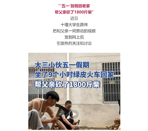 在薛炜发的砍柴视频中,薛炜写道,“莫欺少年穷,终有一天,我也会搬进属于自己明亮宽敞的大房子,买到下雨可以畅通出行的小汽车,冬天不用烧火炉有暖暖的空调,不会再砍柴劈柴、步行回老家……但会一直保留父亲身上的那份勤劳。”众多网友在视频下留言,“我多干一点,爸妈就会少做一些!”“这才是五一劳动节的意义,非常正能量。”