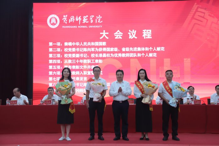 会上,陈向军为全国教育系统先进集体——音乐学院、黄梅戏学院领导班子成员、2023年“湖北省十佳师德标兵”段友芳教授、2023年度“楚天名师”陈志平教授献花。