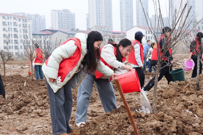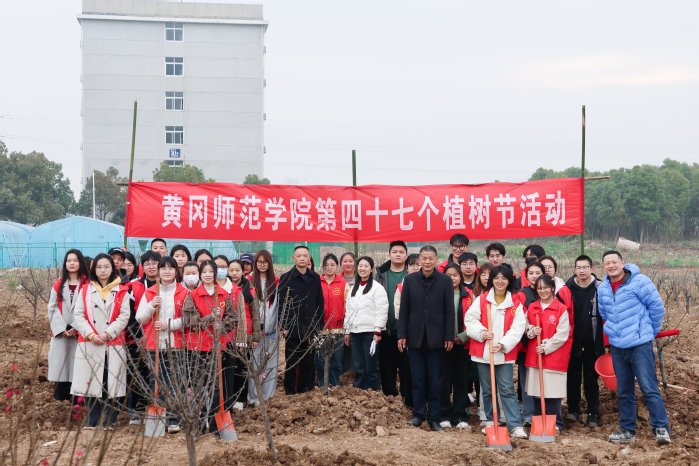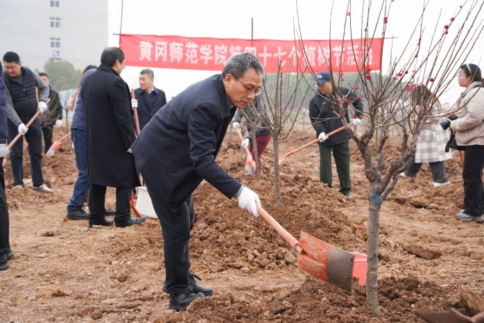 活动伊始,漆昌柱率先挽袖执锹,与师生一同翻开湿润的春泥。扶苗培土、提水浇灌、压实土层,校领导、党员干部与学生志愿者们默契配合,一株株红榉、桃树、李树等树苗在春风中亭亭而立。红榉谐音‘举’,桃李喻指学子,种下这些树,寓意黄师人皆成栋梁之材。此次活动共栽种红梅、红榉、桃树、李树等苗木近百株,为校园再添诗意生态画卷。