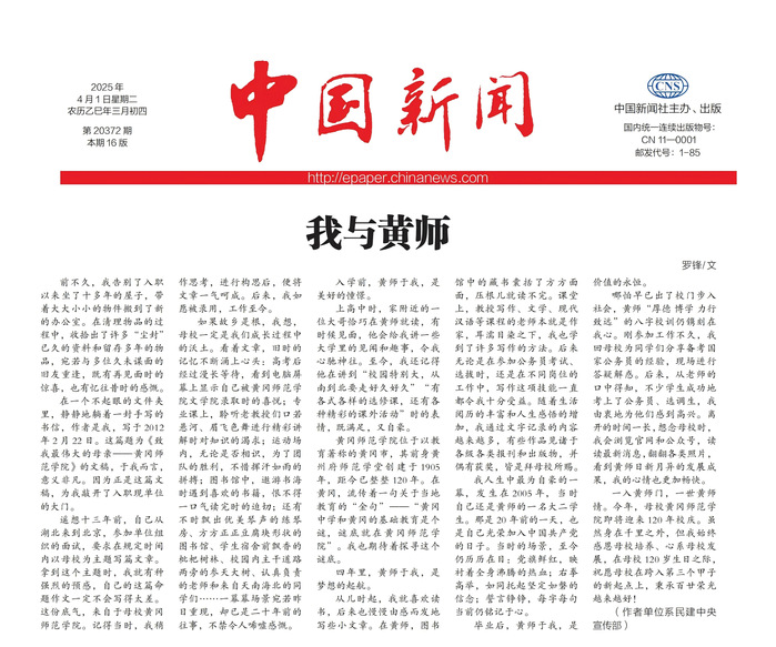 【黄师情】我校校友罗锋在《中国新闻》报上发表文章《我与黄师》
