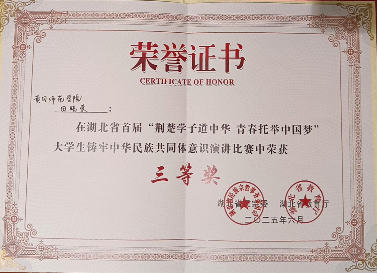 本网讯 6月16日,湖北省首届“荆楚学子道中华 青春托举中国梦”大学生铸牢中华民族共同体意识演讲比赛决赛在三峡大学圆满落幕。我校教育学院田晓荣同学获三等奖。