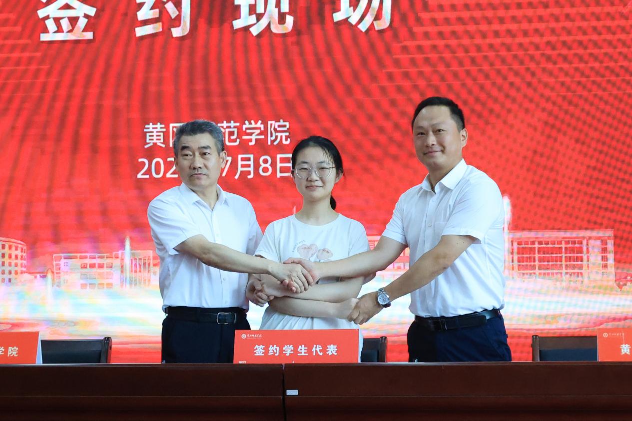 汉语言文学专业拟录取新生瞿春银同学、物理学专业拟录取新生王好同学作为新生代表上台进行三方协议签约。